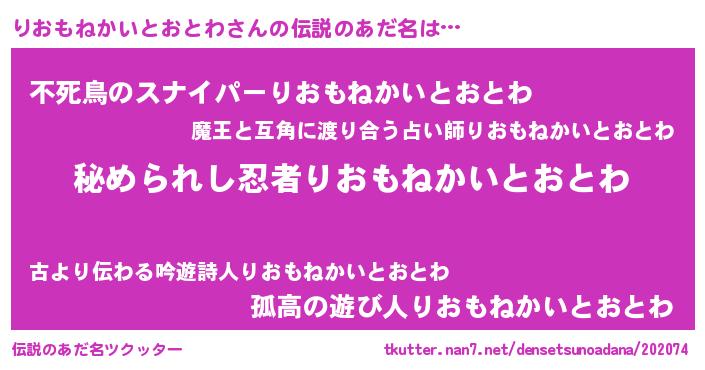 | 男性向けラノベタイトル風あだ名 | 『緋弾のリオモネカイトオトワ』 |