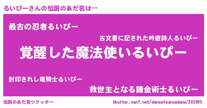 | 男性向けラノベタイトル風あだ名 | 『Re:るいぴーから始める異世界生活』 |