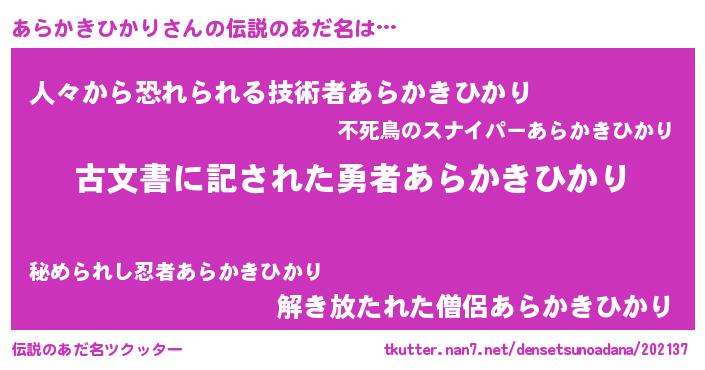 | ヘコむあだ名 | 『あらかきひかり(震え声)』『あら太郎』 |