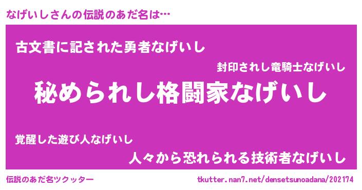 | ヒーロー風カッコイイあだ名 | 『ウルトラなげいしマン』『ネオナゲイシ』 |