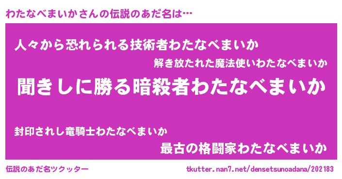 | ヒーロー風カッコイイあだ名 | 『ネオワタナベマイカ』『幻影騎士ワタ』 |