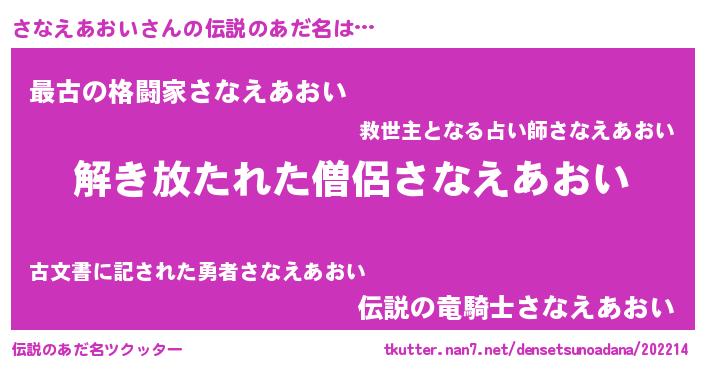 | 欧米人風あだ名 | 『ウサインさなえあおい』 |
