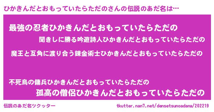 | 胡散臭い通販商品みたいなあだ名 | 『世界中を虜にした世界で10本だけ現存している希少なブランデー…その名も「ひかきんだとおもっていたらただの」』 |