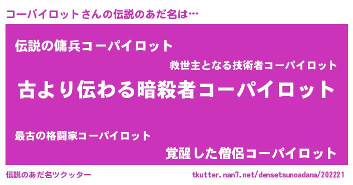 | 胡散臭い通販商品みたいなあだ名 | 『来世でも幸せになれる健康食品…その名も「コーパイロット」』 |