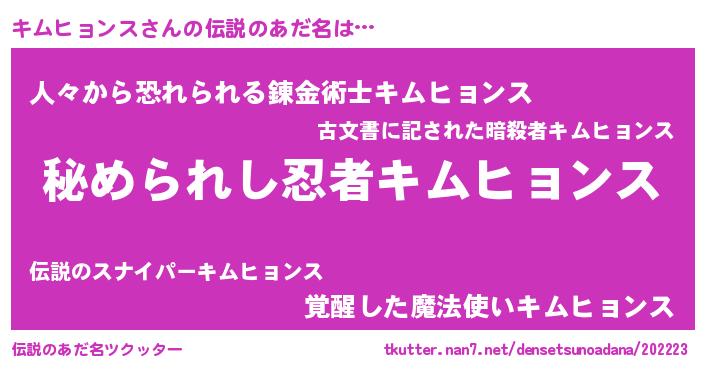 | ヒーロー風カッコイイあだ名 | 『仮面キムダー』『炎刃騎士キム』 |