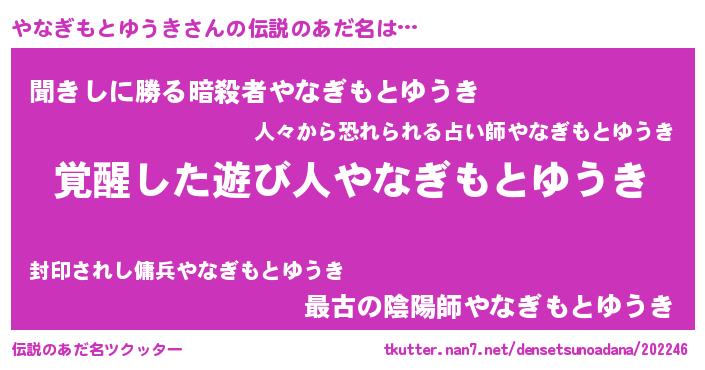 | ポケモン風あだ名 | 『ヒヤナギモトユウキ』『ヤナゴンZ』 |