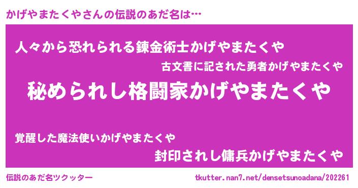 | ファンタジー風あだ名 | 『エターナルカゲヤマタクヤー』 |