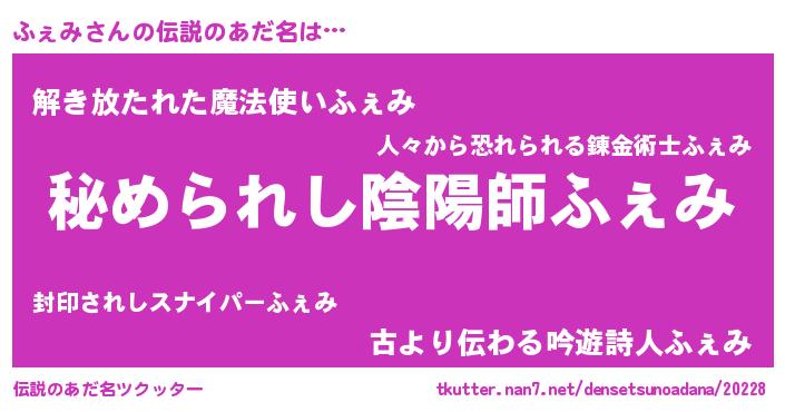 | 意味不明あだ名 | 『めかぶ科ふぇみ属』『永久保存ふぇみ』 |