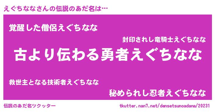 | 意味不明あだ名 | 『永久保存えぐちなな』『自称えぐちなな』 |