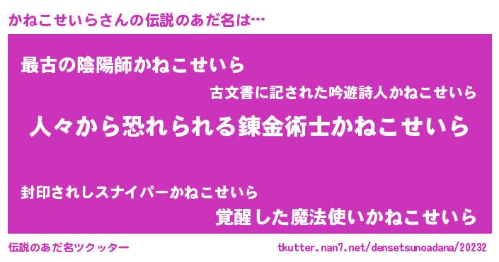 | 男性向けラノベタイトル風あだ名 | 『おまえをオタクにしてやるから、俺をかねこせいらにしてくれ! 』 |