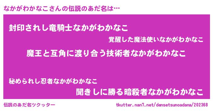 | 女子向けラノベタイトル風あだ名 | 『なかがわかなこ恋絵巻』 |