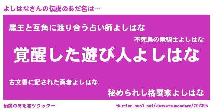 | 男性向けラノベタイトル風あだ名 | 『よしはなに滅ぼされるだけの簡単なお仕事です』 |