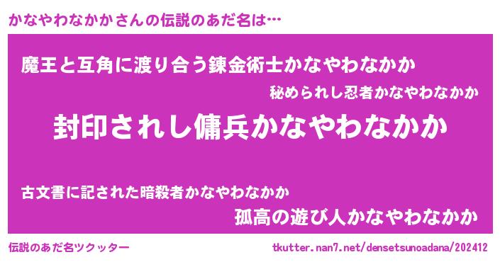 | 男性向けラノベタイトル風あだ名 | 『かなやわなかか~年齢イコール彼女いない歴の魔法使い~』 |