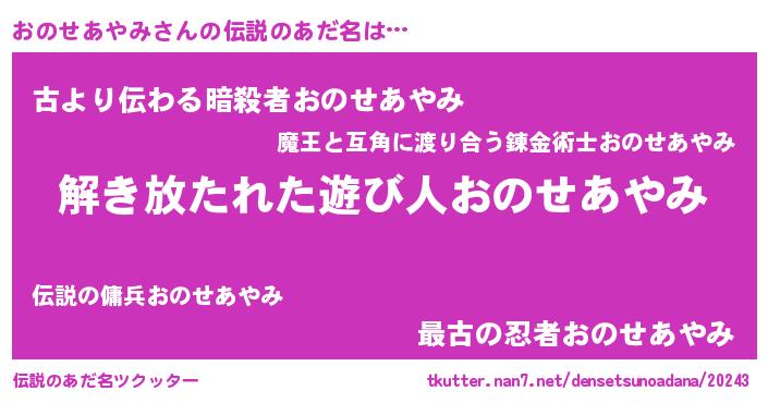 | 意味不明あだ名 | 『住所不定無職おのせあやみ(86歳)』 |