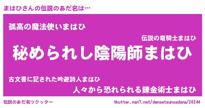 | 女子向けラノベタイトル風あだ名 | 『まはひが死なない童話 林檎のまはひの診療簿』 |