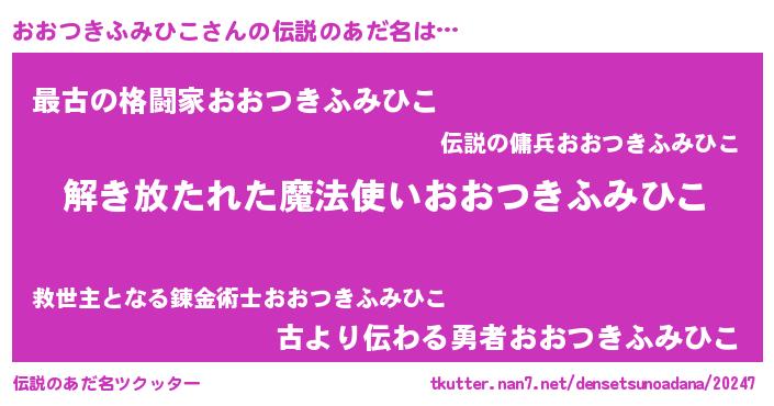 | 男性向けラノベタイトル風あだ名 | 『転生したらおおつきふみひこだった件』 |
