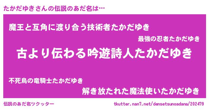 | 意味不明あだ名 | 『永久保存たかだゆき』『自称たかだゆき』 |