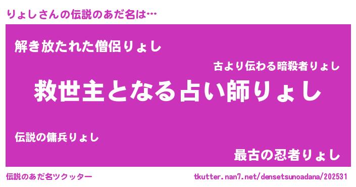 | 男性向けラノベタイトル風あだ名 | 『Re:りょしから始める異世界生活』 |