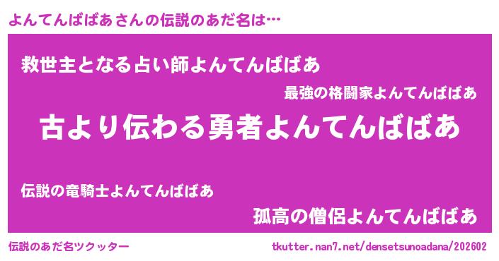 | 男性向けラノベタイトル風あだ名 | 『よんてんばばあという概念が存在しない退屈な世界 』 |