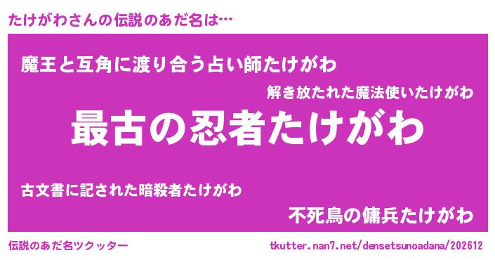 | ヒーロー風カッコイイあだ名 | 『ウルトラたけがわマン』『暗黒騎士タケ』 |