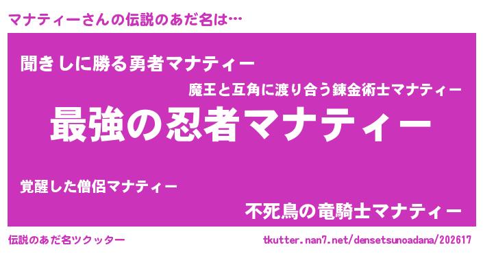 | 男性向けラノベタイトル風あだ名 | 『マナティー~年齢イコール彼女いない歴の魔法使い~』 |