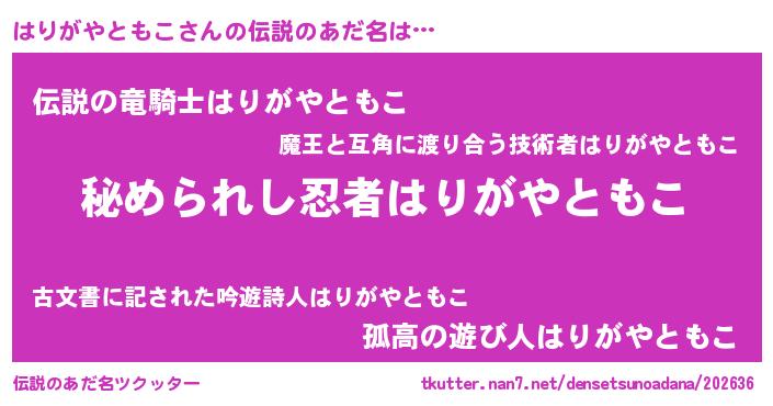 | 男性向けラノベタイトル風あだ名 | 『やはりはりがやともこの青春ラブコメはまちがっている 』 |