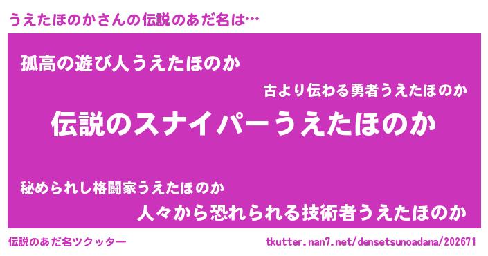 | 胡散臭い通販商品みたいなあだ名 | 『必ず成功する霊験あらたかなお札…その名も「うえたほのか」』 |