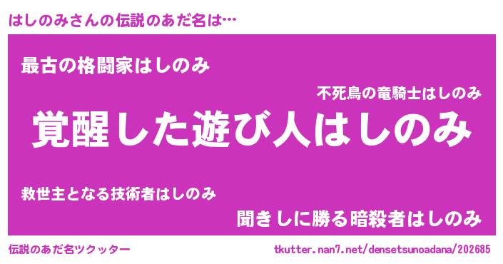 | ヒーロー風カッコイイあだ名 | 『幻影騎士ハシ』『最強戦士ハシノミ』 |