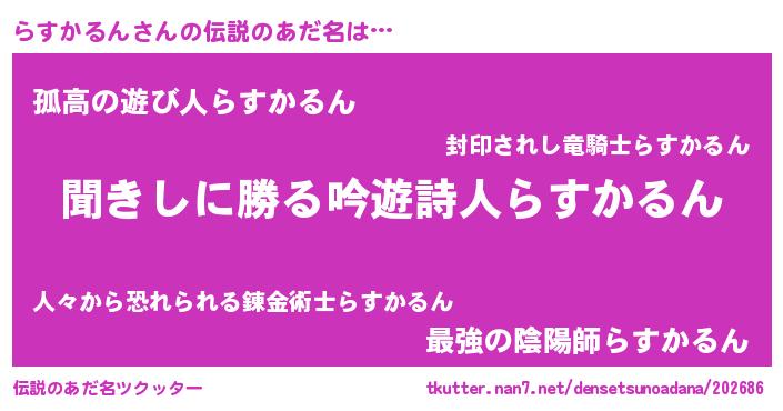 | 男性向けラノベタイトル風あだ名 | 『らすかるんという概念が存在しない退屈な世界 』 |