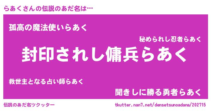 | 胡散臭い通販商品みたいなあだ名 | 『あなたにだけ特別に提供する限定10本のレアな日本酒…その名も「らあく」』 |