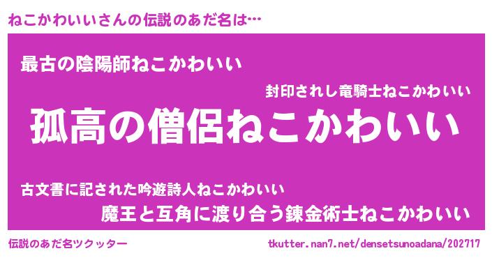 | 女子向けラノベタイトル風あだ名 | 『ねこかわいいなんてお断りですっ。』 |