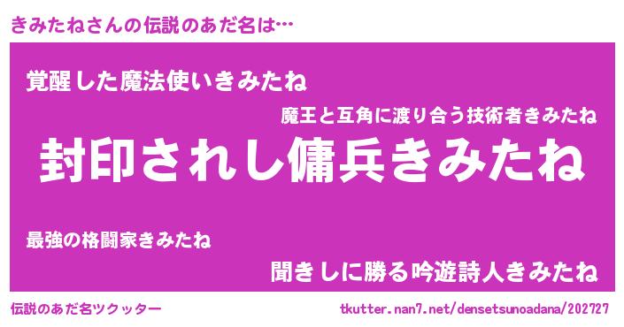 | ヒーロー風カッコイイあだ名 | 『スーパーキミタネ』『炎刃騎士キミ』 |