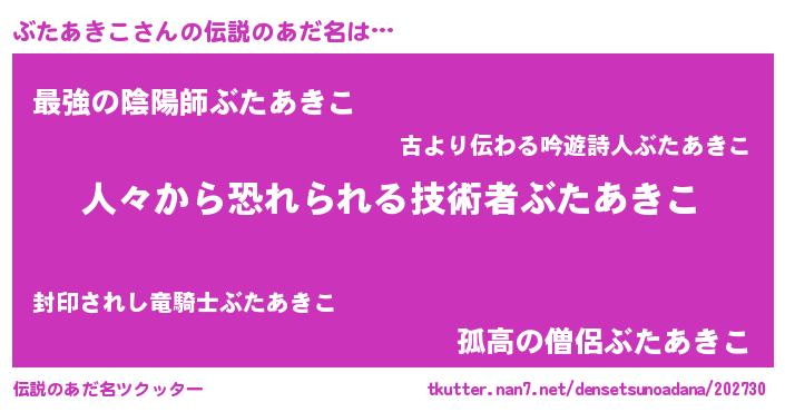 | 意味不明あだ名 | 『自称ぶたあきこ』『永久保存ぶたあきこ』 |