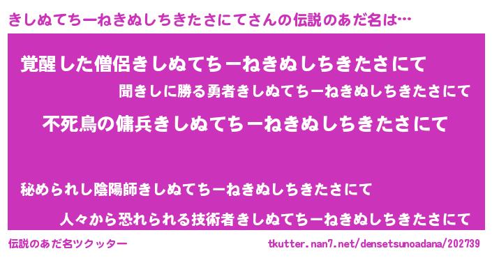 | 男性向けラノベタイトル風あだ名 | 『キシヌテチーネキヌシチキタサニテアートオンライン』 |