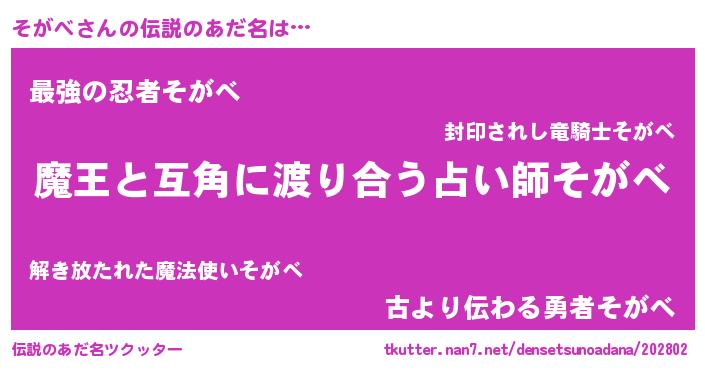 | 意味不明あだ名 | 『自称そがべ』『住所不定無職そがべ(89歳)』 |