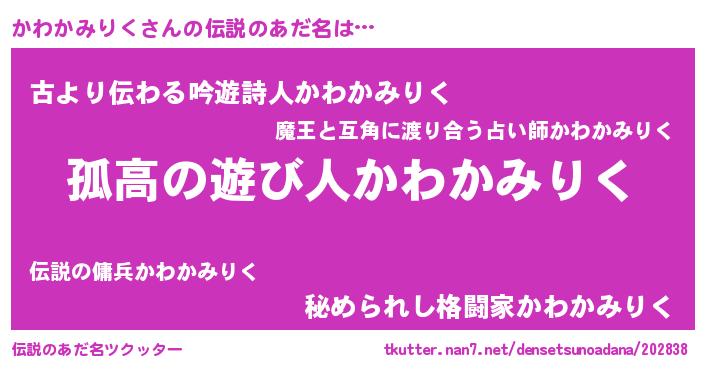 | 男性向けラノベタイトル風あだ名 | 『ダンジョンにかわかみりくを求めるのは間違っているだろうか』 |