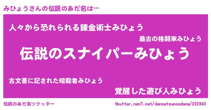 | 意味不明あだ名 | 『ペロリンみひょう』『自称みひょう』 |