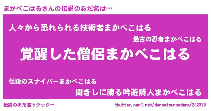 | ヒーロー風カッコイイあだ名 | 『天弓騎士マカ』『ネオマカベコハル』 |