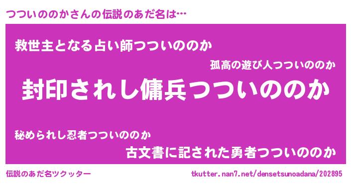 | 男性向けラノベタイトル風あだ名 | 『Re:つついののかから始める異世界生活』 |