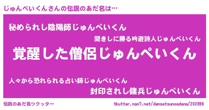 | 男性向けラノベタイトル風あだ名 | 『じゅんぺいくんの嫁は女の子じゃないと思った?』 |