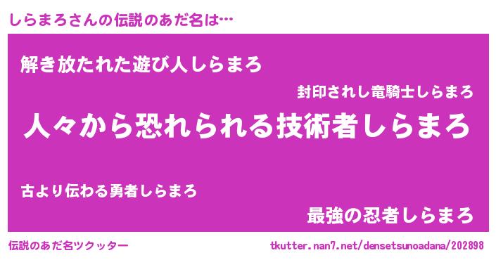 | 男性向けラノベタイトル風あだ名 | 『おまえをオタクにしてやるから、俺をしらまろにしてくれ! 』 |