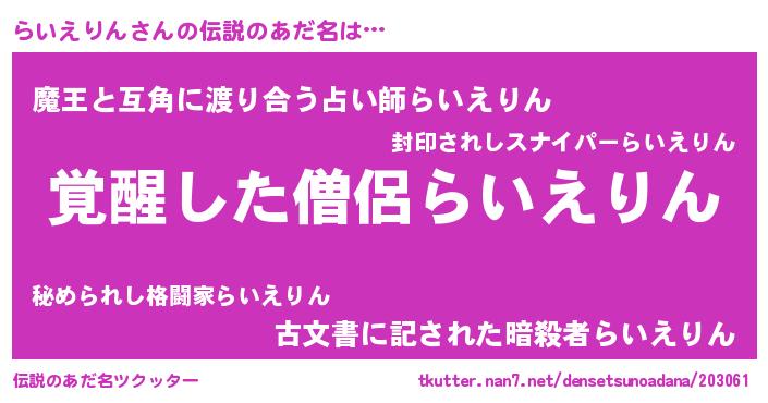 | ヘコむあだ名 | 『らいっ子』『らいえりん(笑)』 |