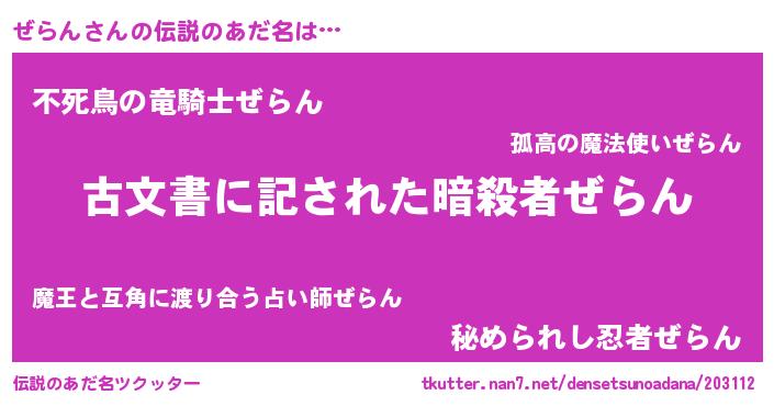 | 胡散臭い通販商品みたいなあだ名 | 『前代未聞の健康食品…その名も「ぜらん」』 |