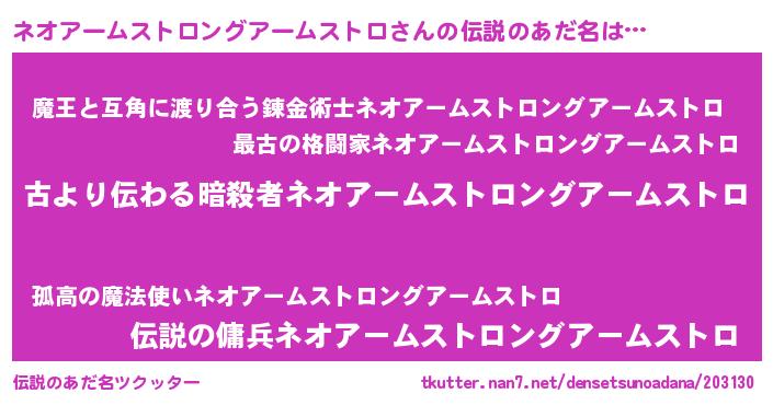 | 胡散臭い通販商品みたいなあだ名 | 『来世でも幸せになれる健康食品…その名も「ネオアームストロングアームストロ」』 |