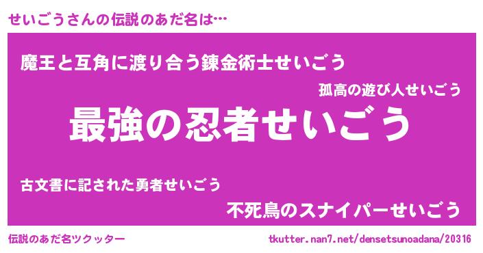 | ヒーロー風カッコイイあだ名 | 『究極戦士セイゴウ』『愛の使者せいごう』 |