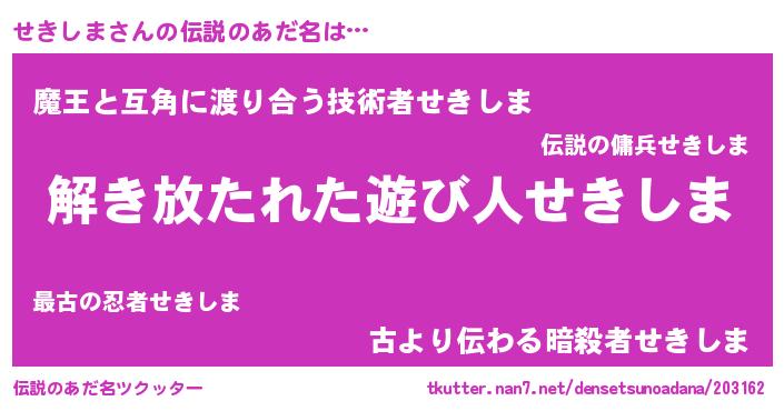 | ヒーロー風カッコイイあだ名 | 『幻影騎士セキ』『最強戦士セキシマ』 |