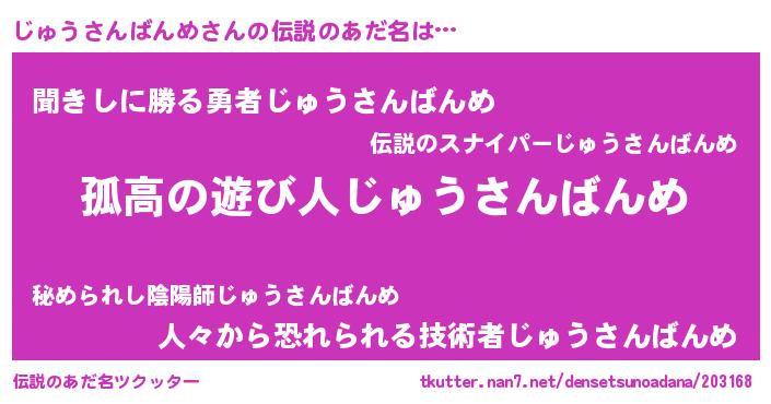 | ヒーロー風カッコイイあだ名 | 『暗黒騎士ジュ』『ネオジュウサンバンメ』 |