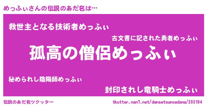 | 男性向けラノベタイトル風あだ名 | 『魔法科高校のめっふぃ』 |