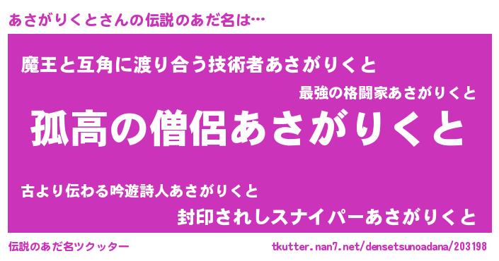 | 恥ずかしいあだ名 | 『アサガリクトデラックス』『あさっちょ』 |