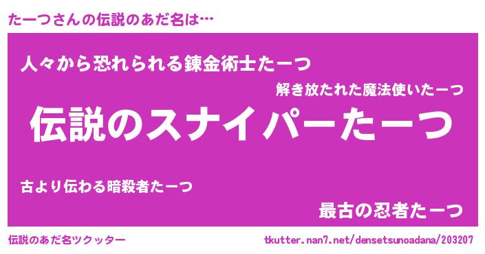 | 女子向けラノベタイトル風あだ名 | 『(仮)たーつのやんごとなき事情』 |